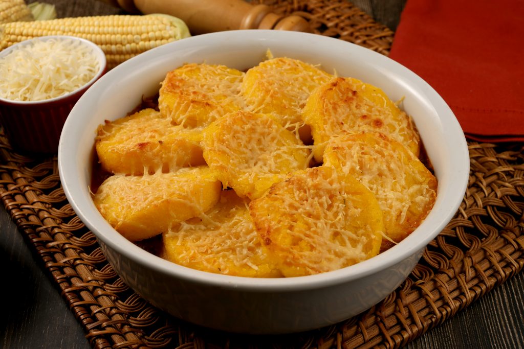 PETISCO DE POLENTA GRATINADA COM CARNE MOÍDA